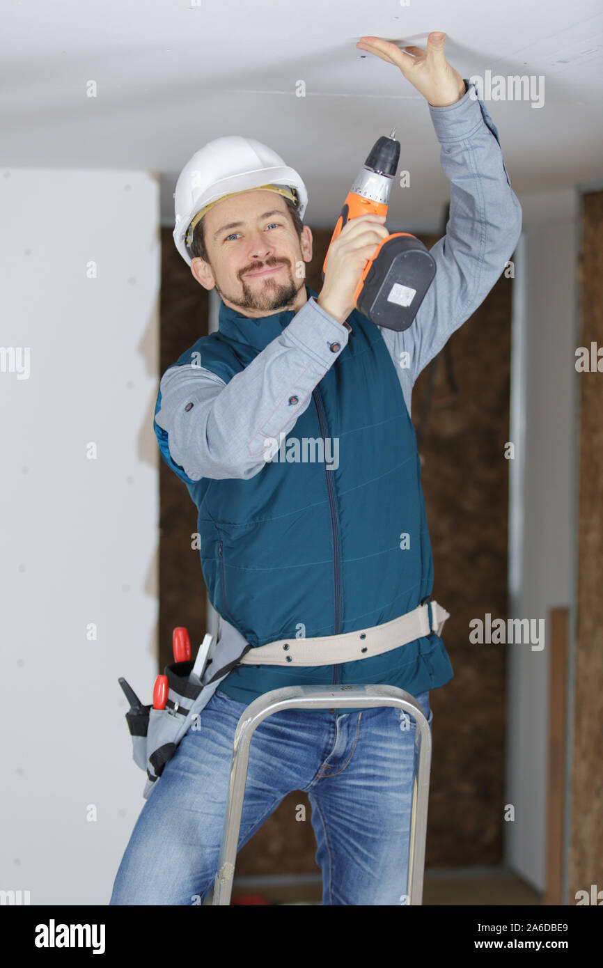 Man Fixing Plasterboard Ceiling Using Battery Power Cordless